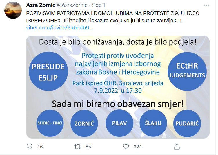 Na nove proteste danas je uputila poziv jedna od apelantica pred Evropskim sudom za ljudska prava Azra Zornić. “Poziv svim patriotama i domoljubima na proteste 7.9. u 17:30 ispred OHR-a. Ili izađite i iskažite svoju volju ili šutite zauvijek!!!”, napisala je Zornić na Twitteru.