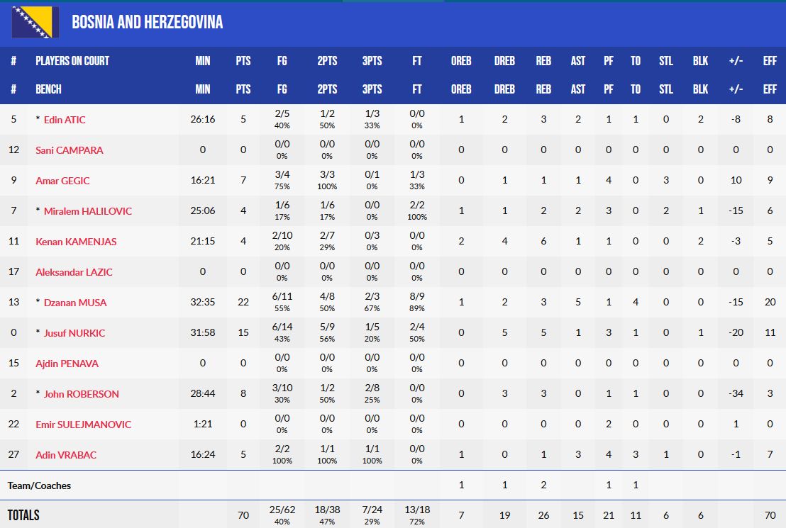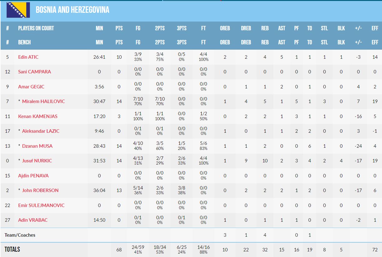 E sad šta reći o igračima? Generalno Musa, Nurkić i Roberson su debelo podbacili, Kamenjaš izgubljen, Halilović najozbiljniji sa Atićem, Lazić 10 minuta a Vrabac 15 bez poena!!!!! I onda ne uvedeš Penavu!