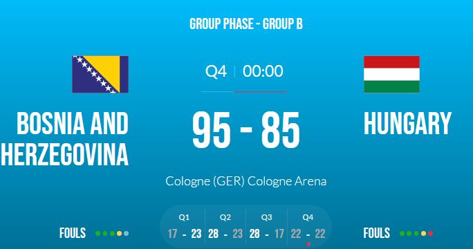 Košarkaši Bosne i Hercegovine su odličnom igrom i pobjedom otvorili Evropsko prvenstvo u košarci u njemačkom gradu Kelnu sa 95:85. Ova pobjeda je izuzetno bitna jer su najteže one prve utakmice. Musa, Nurkić, Roberson i Halilović su bili odlični međutim i ostali igrači su odlično odigrali svoje role i zaslužni za ovu izuzetno važnu pobjedu. Potrebna nam je još jedna za prolaz u sljedeći krug. A sljedeća je protiv domaćina Njemačke u subotu u 14.30 i ako pobjedimo mi smo u drugom krugu.