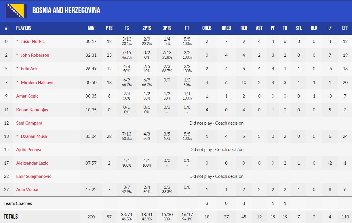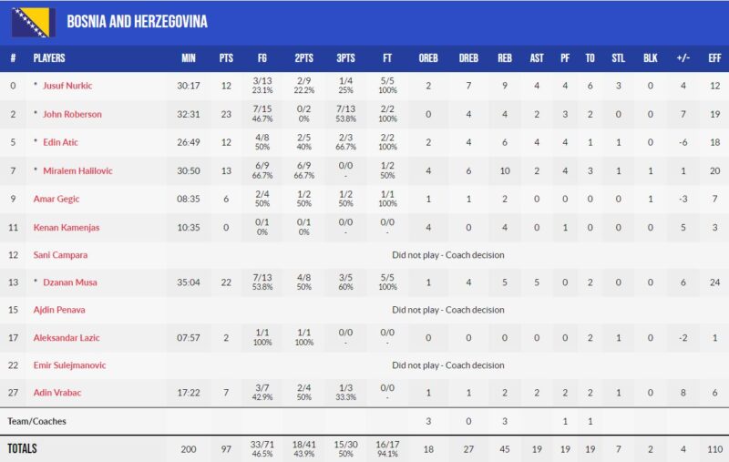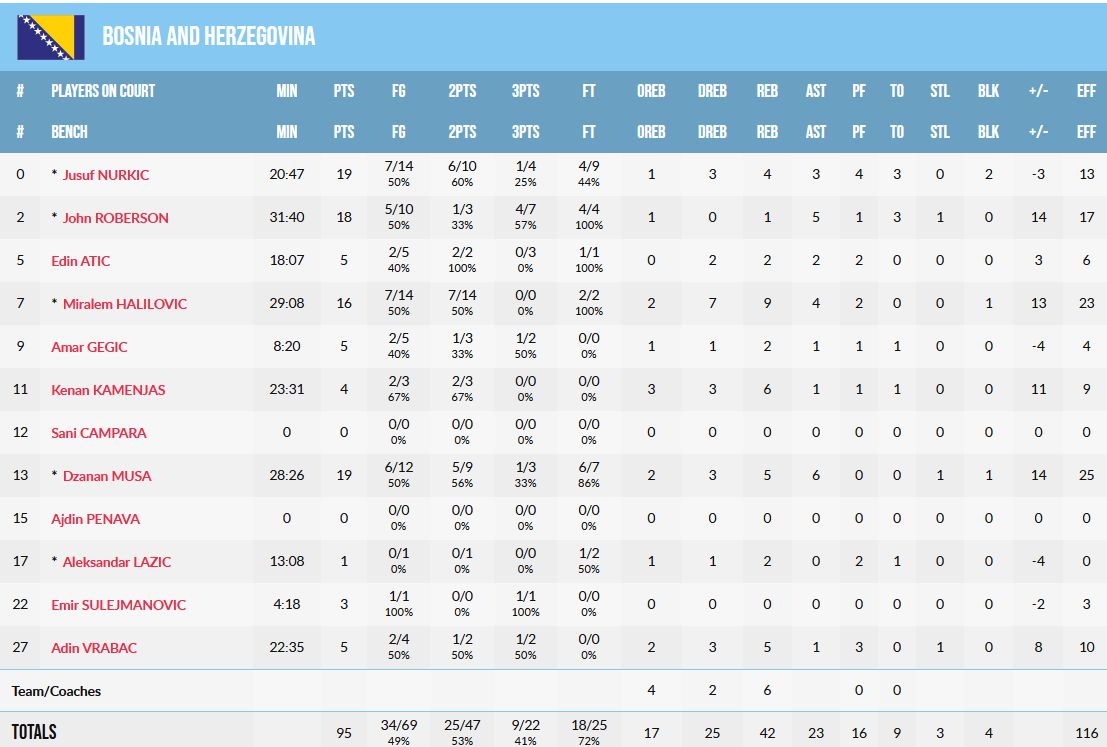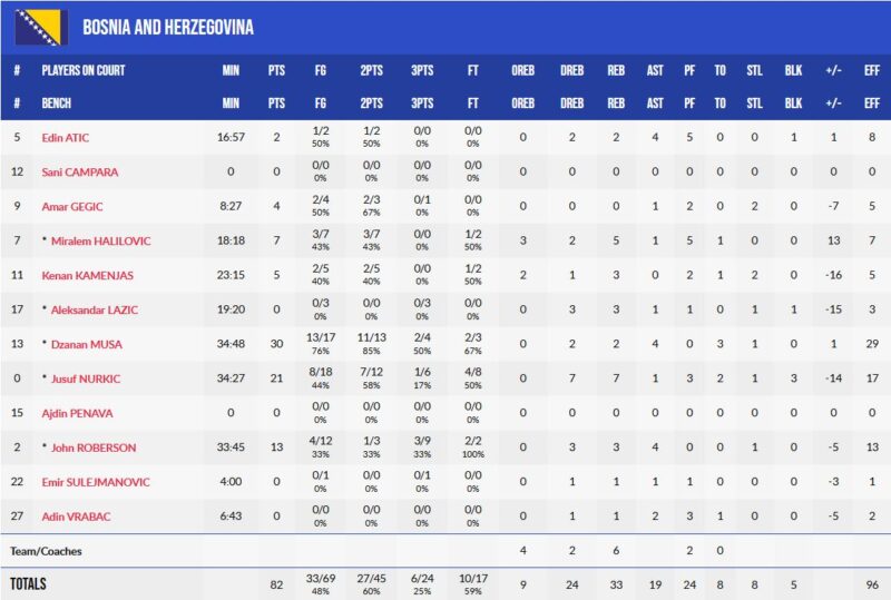 Statistika ne laže? Bosna i Hercegovina je bila ubitačna sa šutevima izvana, pogađajući 50 posto trojke, a također je izvela 16 od 17 slobodnih bacanja – uključujući sva četiri u posljednjih 13,5 sekundi.