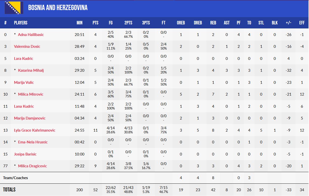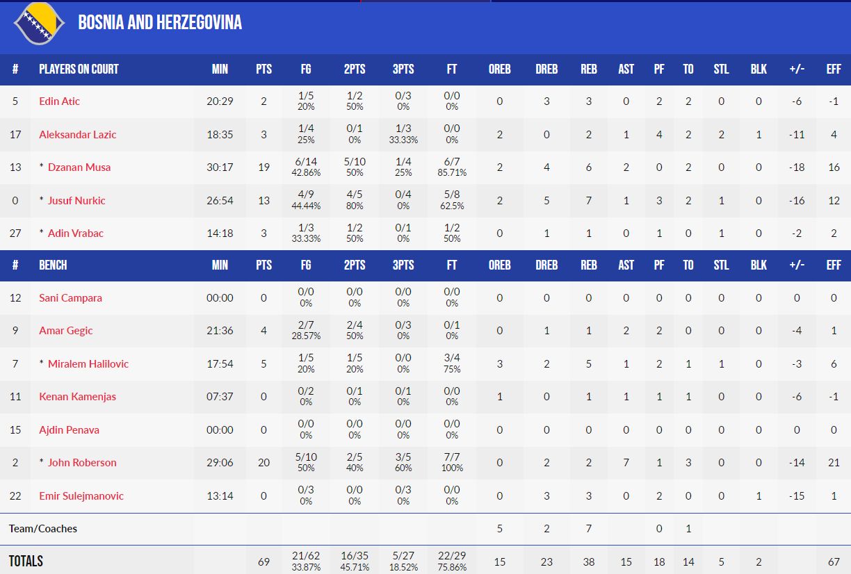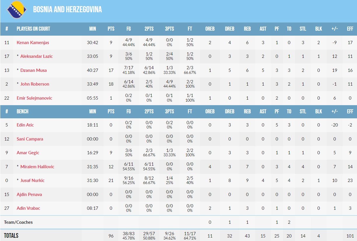 BiH: Halilović 10, Lazić 9, Musa 17, Nurkić 21, Roberson 18, Atić, Čampara, Gegić 9, Kamenjaš 9, Penava, Sulejmanović 1, Vrabac.