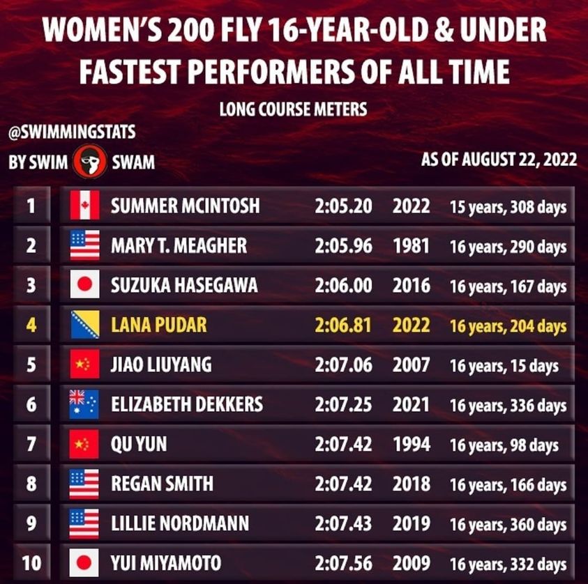 Lana Pudar u konkurenciji 16 godina na 200m delfin ima četvrto vrijeme na svijetu svih vremena!!!! Published August 22, 2022 0 0 votes Article Rating Label {} [+] Name* Email Website Δ Label {} [+] Name* Email Website Δ 0 Comments Oldest Newest Most Voted Inline Feedbacks View all comments