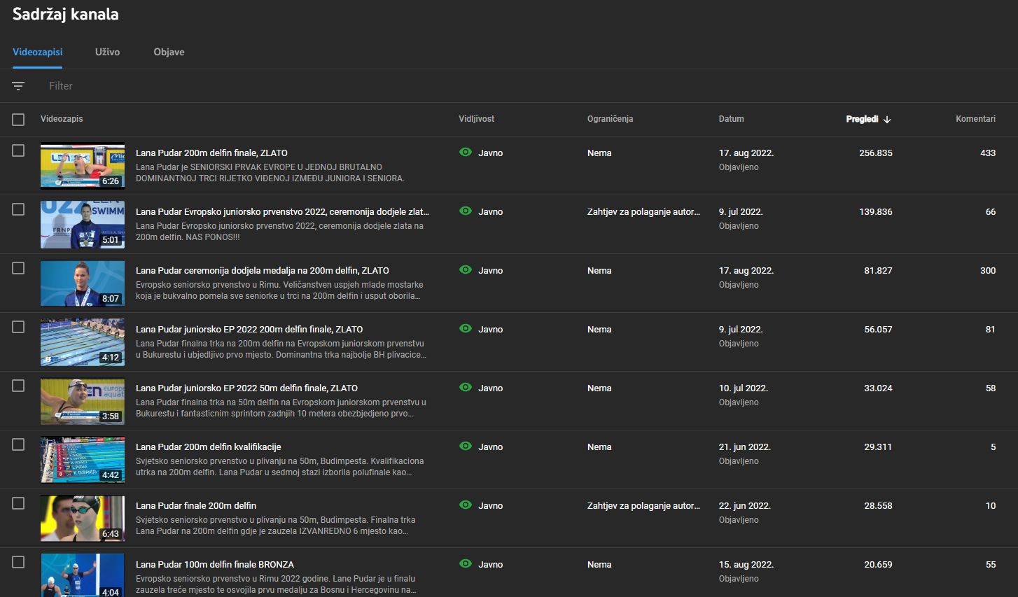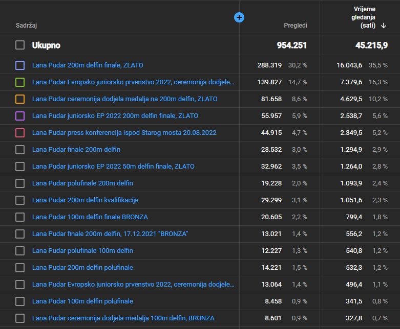 Dakle od 29.10.2021 godine kada je postavljen prvi snimak Laninih trka sa svjetskog kupa u Kazanu i finalne trke na 200m delfin ovi snimci su doživjeli NEVJEROVATNIH I IMPRESIVNIH 954.251 PREGLEDA!!!! Samo u posljednjih mjesec dana bilo je preko pola miliona pregleda i takve navijače u ovome sportu nema niko.