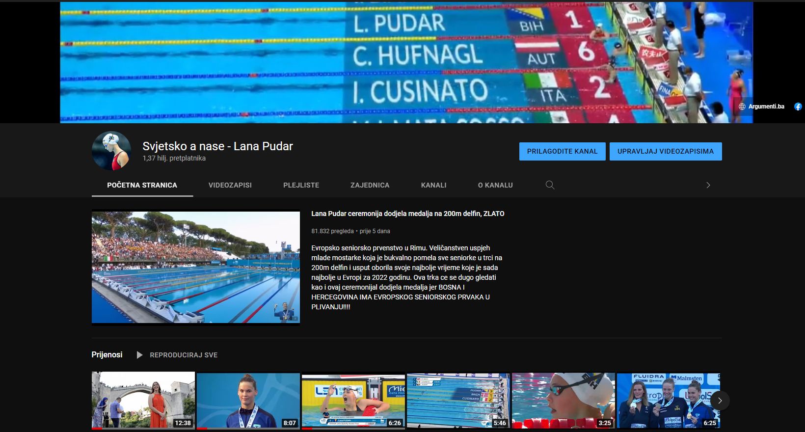 Kao što ste mogli primjetiti Lana Pudar ima i svoj nezvanični YouTube kanal koji je pokrenula moja malenkost 29.10.2021 godine bez ikakvih zadnjih namjera već isključivo iz razloga da bi nastupi ove sjajne mlade mostarke dospjeli do što više računara, talevizora i domova. Sva njena takmičenja ili 99% njih od tada i svi snimci njenih trka i dodjela medalja se nalaze na ovom kanalu što nadam se i ona sama koristi da bi analizirala svoje trke i vidjela gdje je dobra a gdje griješi. Međutim ni u snovima nisam mogao da sanjam da će ovaj kanal doživjeti toliku popularnost i da će toliko ljudi gledati trke i snimke naše najbolje plivačice.