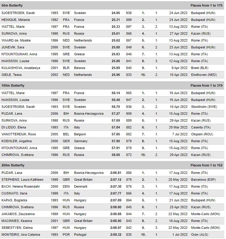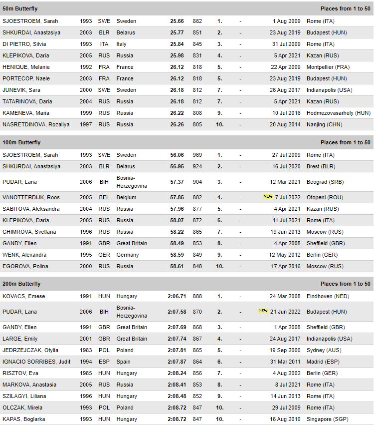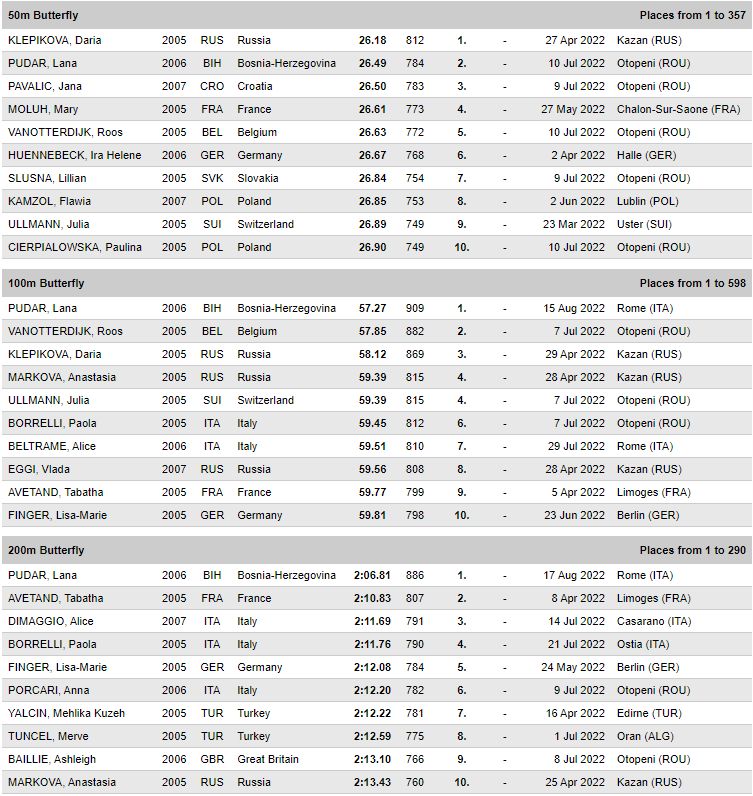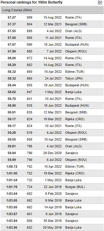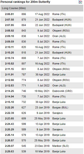 “Djevojčice sa 16 godina već mogu u seniorskoj konkurenciji biti vrhunske. Nema sumnje da će to Lana biti u toj dobi”, kazala mi je tada Alena Ćemalović. I nije pogriješila. Pogodila je u dan, bukvalno, sat, minut, sekund, a ne u godinu. A Lana je bljesnula i prije. S 15 godina počela je skupljati medalje na velikim takmičenjima i u svojoj juniorskoj i u seniorskoj konkurenciji. U decembru 2021. uzela je broncu na Svjetskom prvenstvu u Abu Dhabiju također na 200 metara delfin. U proteklih godinu dana uz svjetske došlo je još sedam medalja takmičeći se u seniorskoj i juniorskoj konkurenciji na Svjetskim i Evropskim prvenstvima te Mediteranskim igrama.