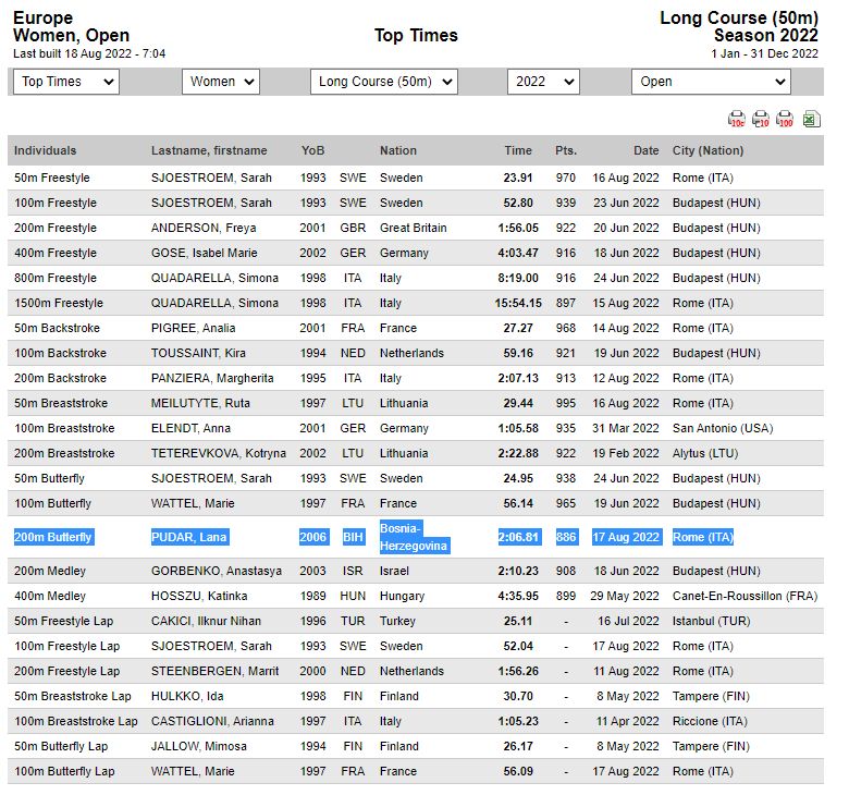 Onako skočiti u vodu, izroniti i isplivati evropsko zlato u vremenu 2:06:81 (najbolje u Evropi i šesto u svijetu ove godine) i pri tome ne ispuštajući vodstvo od prvog do dvijestotog metra može samo – LANA PUDAR! Šesnaestogodišnjakinja, još uvijek juniorka, to je učinila u kompleksu Foro Italico u Rimu i to u kategoriji seniorki. Kada sam 2016. godine radio Lanin prvi intervju pomagala nam je u nastanku istog njena trenerica Alena Ćemalović. Tada 10-godišnja Lana imala je zaokruženih 150 medalja s raznih mitinga i prvenstava u mlađim uzrastima. Alena je tada predvidjela ovo: