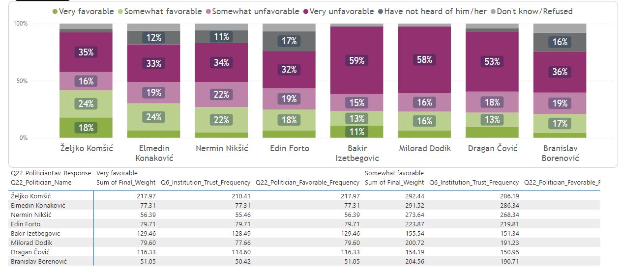 Prema ovoj anketi, najpozitivniji pogled građani imaju prema lideru Demokratske fronte (DF) i članu Predsjedništva BiH Željku Komšiću. 18% ispitanih ima jako povoljno mišljenje, dok 24% ima donekle povoljno mišljenje o njemu. Međutim, 35% ispitanih ima jako nepovoljno mišljenje, a 16% donekle nepovoljno mišljenje.