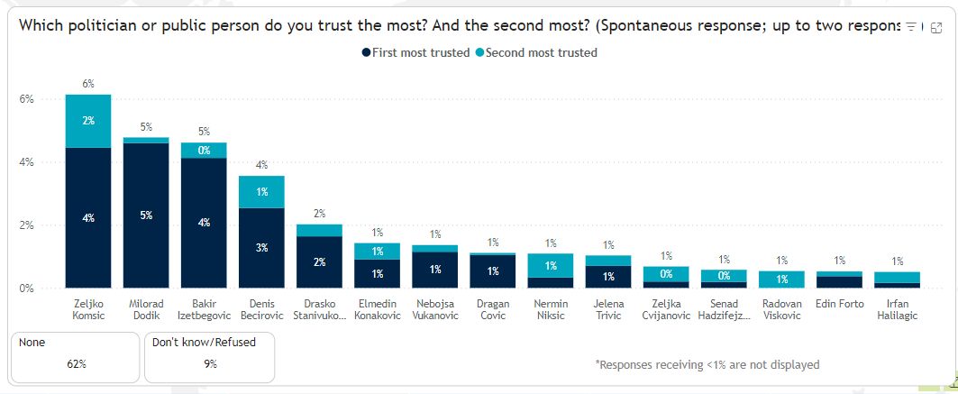 Ipak, za Željka Komšića 6% ispitanika je kazalo da ima povjerenja u njega, 4% ga je stavilo na prvo mjesto, dok je 2% ispitanika Komšića stavilo na drugo mjesto. Milorad Dodik je političar u kojeg 5% ispitanika ima najviše povjerenja.