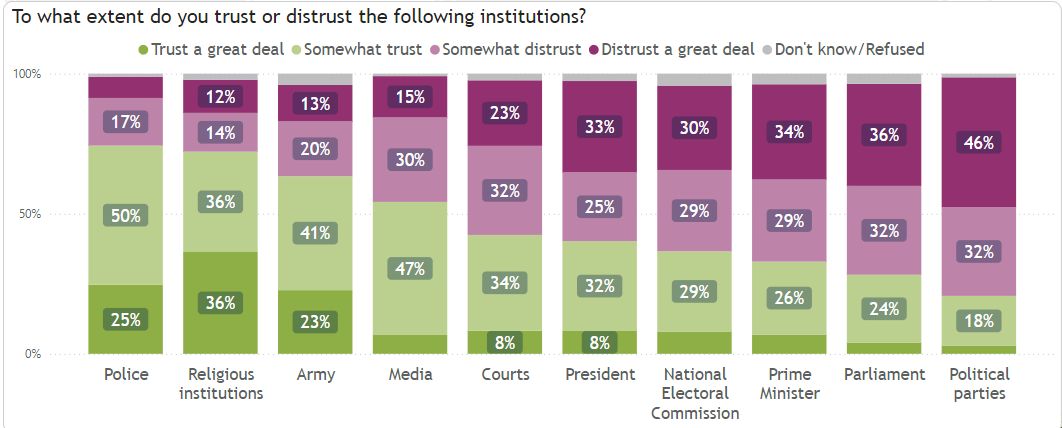 U Oružane snage BiH vjeruje 64% ispitanika; 23% ima veliko povjerenje, a 41% donekle vjeruje. Medijima donekle povjerenje ima 47% ispitanika, dok 7% ima veliko povjerenje. Najmanje povjerenje građani imaju u političke stranke; samo 18% donekle vjeruje političkim strankama, dok 3% u potpunosti vjeruje. Čak 46% građana nikako ne vjeruje političkim strankama, a 32% donekle ne vjeruje.