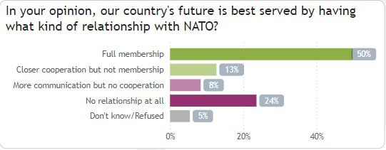 50% ispitanika bi voljelo da smo punopravni član NATO pakta, 13% da postoji saradnja ali bez punog članstva, 8% da imamo stalnu komunikaciju ali ne saradnju, 24% bez ikakve saradnje i 5% nije imalo odgovor.