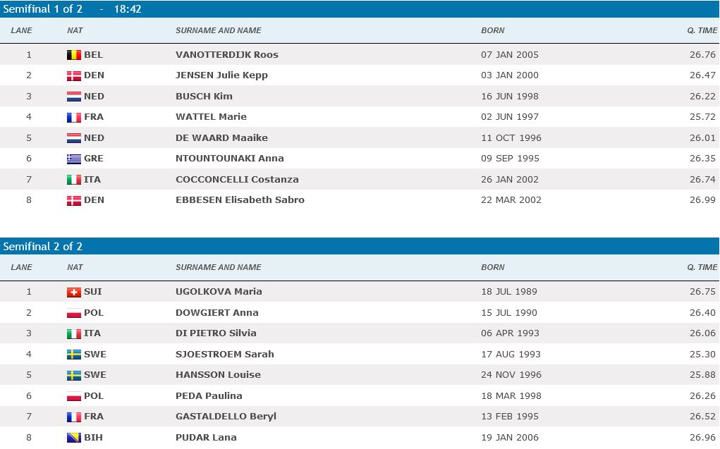 Taman negdje kad naši mladi momci budu privodili svoju utakmicu kraju u polufinalnoj utrci u disciplini 50m delfin nastupit će Lana Pudar. Plivat će u drugoj skupini u stazi 8 ali što će joj biti puno bitnije i važnije u toj grupi će plivati i najbolja delfinašica na svijetu, naravno u stazi 4, Sarah Sjoestroem. Kud ćeš veće motivacije od te da ganjaš nabolju na svijetu. Trka kako kažu u FINI počinje u 18.42.