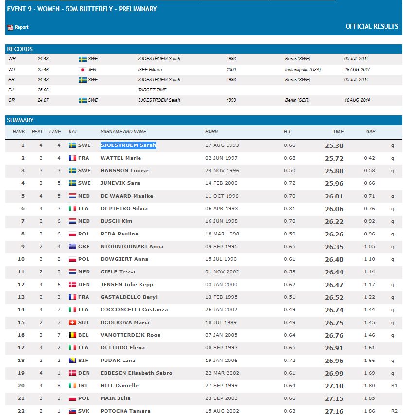 Naravno bez dileme prvo mjesto je ubjedljivo uzela najbolja svjetska plivačica u ovoj disciplini SJOESTROEM Sarah sa rezultatom 25.30